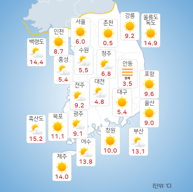 - 강수량: 서해 5도 지역은 아침(06~09시)부터 낮(12~15)까지 가끔 비가 내릴 것으로 예상되며, 서해 5도 지역은 5~10mm, 서울, 인천, 경기도 지역은 5mm 내외의 강수량의 예상됩니다.