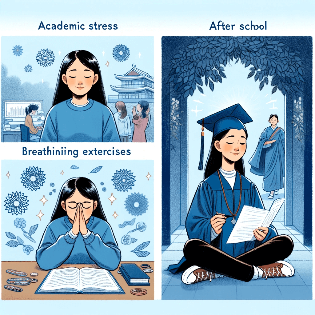 중학교 2학년인 혜린은 학업 스트레스와 시험 불안으로 어려움을 겪고 있었습니다. 그녀의 부모는 혜린의 스트레스를 인식하고, 함께 해결책을 찾기로 했습니다. 혜린은 자기 전 명상과 호흡 운동을 시작했으며, 학교 후에는 취미 활동인 그림 그리기에 시간을 할애했습니다. 이러한 변화는 혜린이 스트레스를 효과적으로 관리하고 학업에 더 집중할 수 있게 도왔습니다. 결과적으로 혜린은 시험 성적이 향상되었고, 학교 생활에 대한 태도가 긍정적으로 변했습니다.