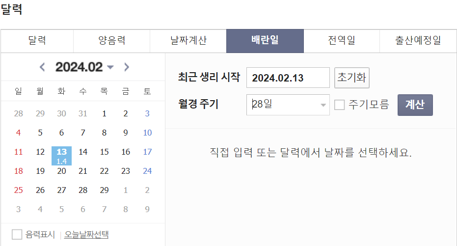 스크린샷에 보이는 계산기처럼, 여러분은 두 가지 정보를 입력해야 해요, 첫 번째는 '최근 생리 시작일', 즉 가장 최근에 시작한 생리 첫 날짜입니다. 두 번째는 '평균 주기 길이', 즉 여러분의 생리가 평균 며칠 간격으로 오는지를 나타내는 숫자예요. 이 두 가지 정보를 입력하면, 계산기는 여러분의 다음 배란일과 가장 임신하기 좋은 기간, 즉 가임기를 예측해 줍니다.